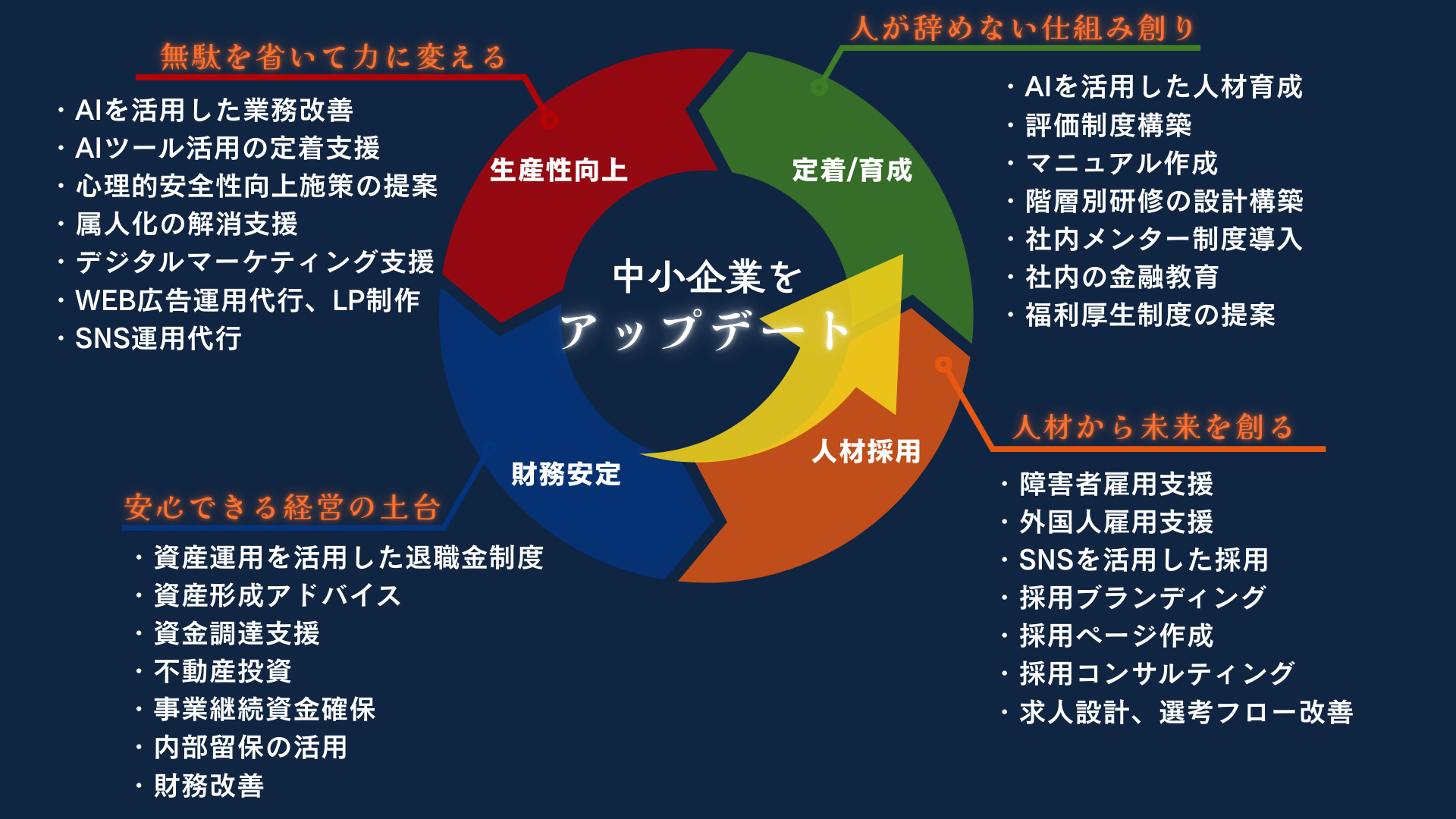 採用・育成・生産性・財務の4領域で、企業の成長をトータルサポート。SNS採用からAI活用、人材定着、資金戦略まで、課題を一緒に見極め、即行動。未来を動かす力を、ここから。